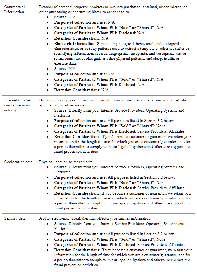 The categories we use to describe the information are those enumerated in the California Consumer Privacy Act (CCPA); categories listed in the CCPA and not covered here are either not collected or financial information not within the scope of the CCPA. Certain personal information may fall into multiple categories.