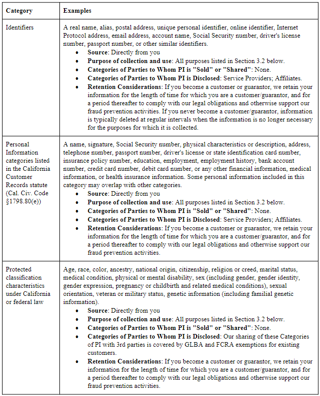 1.1 Customer Lending Activities. This section describes the information we collect when you apply for or use, our financial products and services.